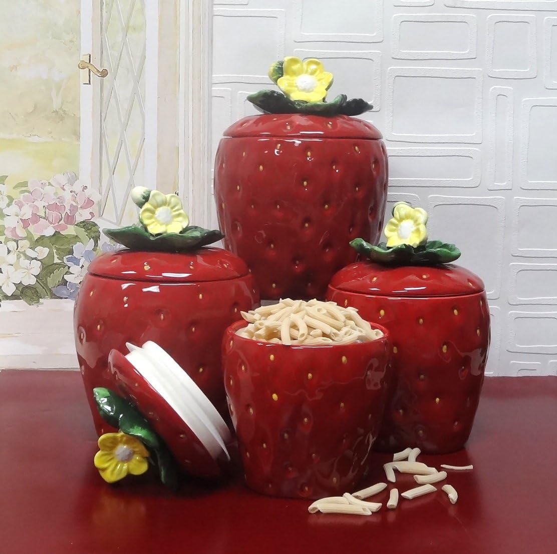 Tuscany Strawberry Shaped, Set of 4 Canisters, 83501 by ACK Beautifully hand painted glazed ceramic "Stay-fresh" neoprene gaskets keep food fresh
