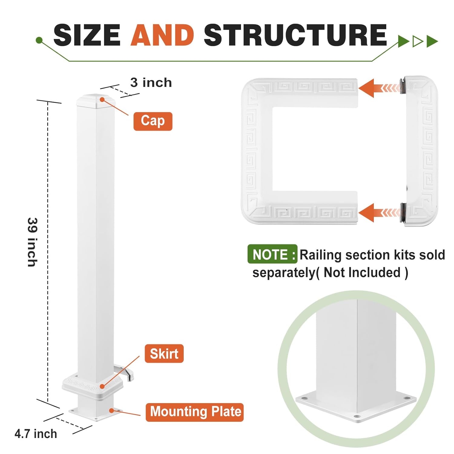 Features: The aluminum railing post kit is adaptable for a variety of outdoor and indoor settings, making it suitable for decks, balconies, and interior spaces. Its design flexibility allows for customization based on specific architectural needs without compromising functionality. This railing post kit is designed with safety in mind, incorporating sturdy construction and reliable materials to provide additional support. It ensures peace of mind while maintaining a sleek and modern appearance in your railing system. Specifications: Material: aluminum Color: white Size: 3 x 3 x 39 inches/ 8 x 8 x 100 cm Package includes: 1 X White Aluminum Railing Post 4 X Expansion Screws Notes: Manual measurement, please allow slight errors on size. The color may exist a slight difference due to different screen displays. Small parts included, please keep them away from little kids to avoid swallowing risk.