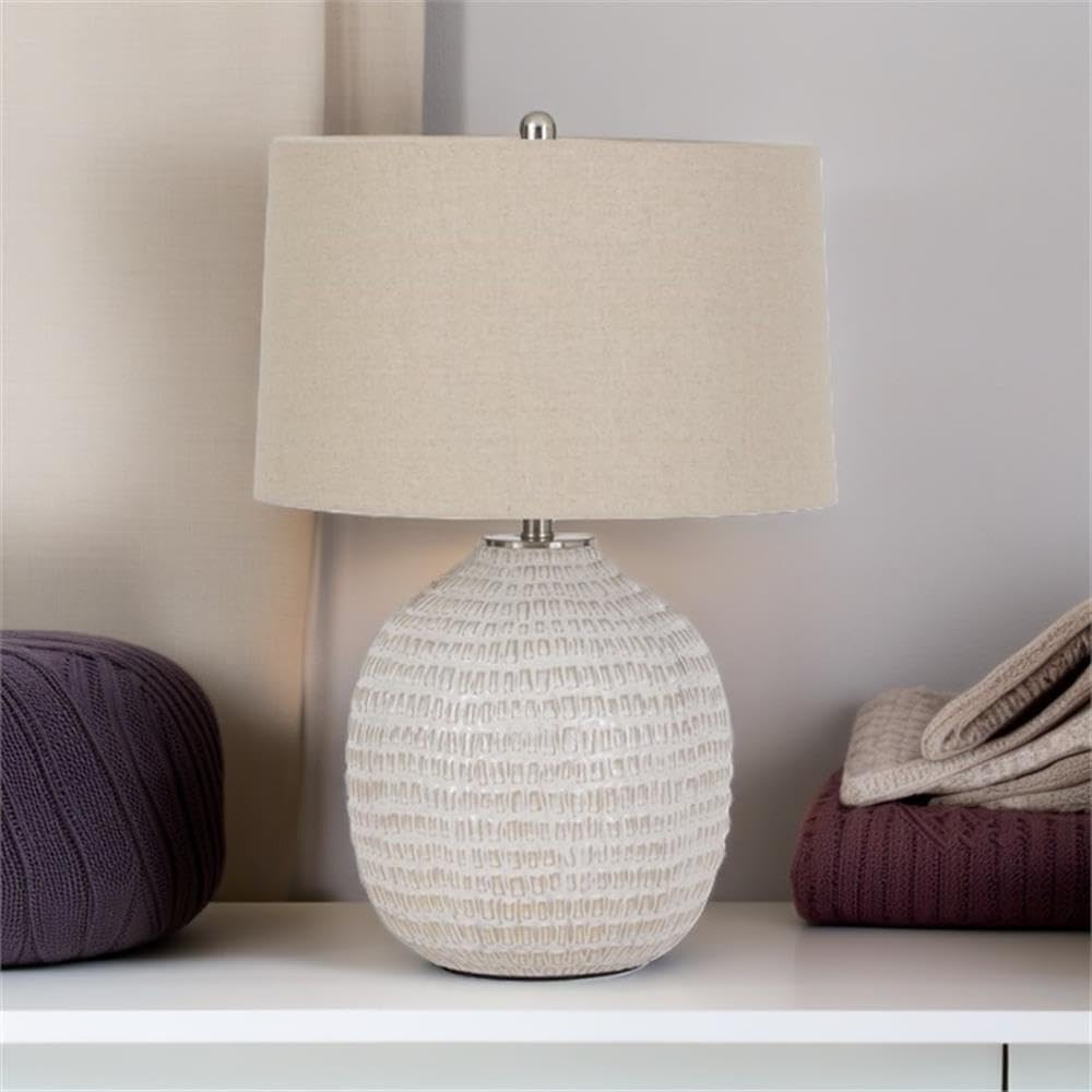 | Additional Features | 3-way switch, Beige and white glaze, Made of ceramic with fabric modified drum shade |
