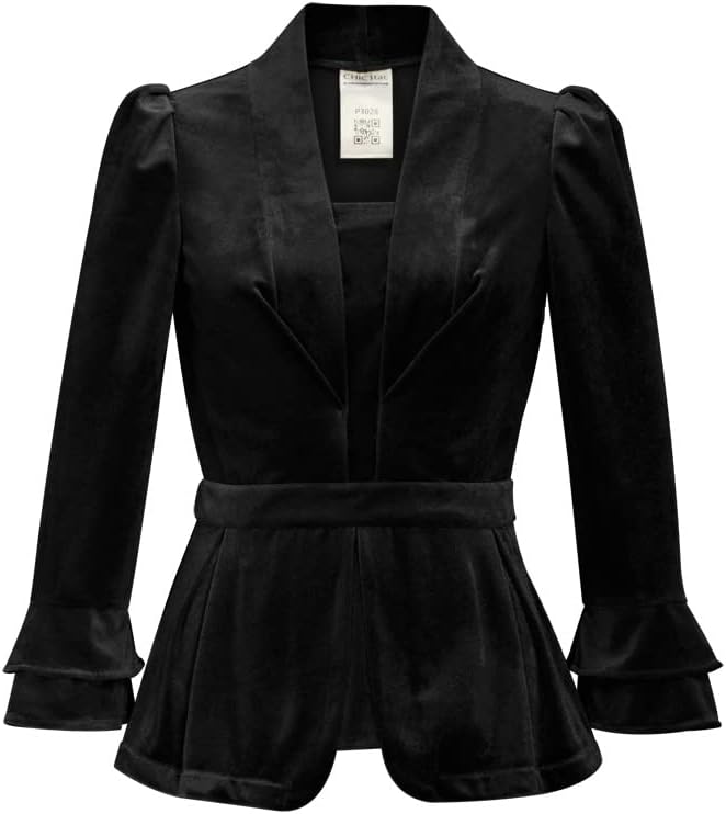 It's a short blazer made of soft velvet fabric. Layer in neckline and cuffs, pleats in waist. Pull on style. Standard size S approx. length: 62 cm/ 24.4 inches; Plus size approx. length: 68 cm/ 26.8 inches. MATERIAL: 95% POLYESTER 5% SPANDEX. CARE: DRY CLEAN WASH SEPARATELY DO NOT BLEACH DO NOT TUMBLE DRY LOW IRON.
