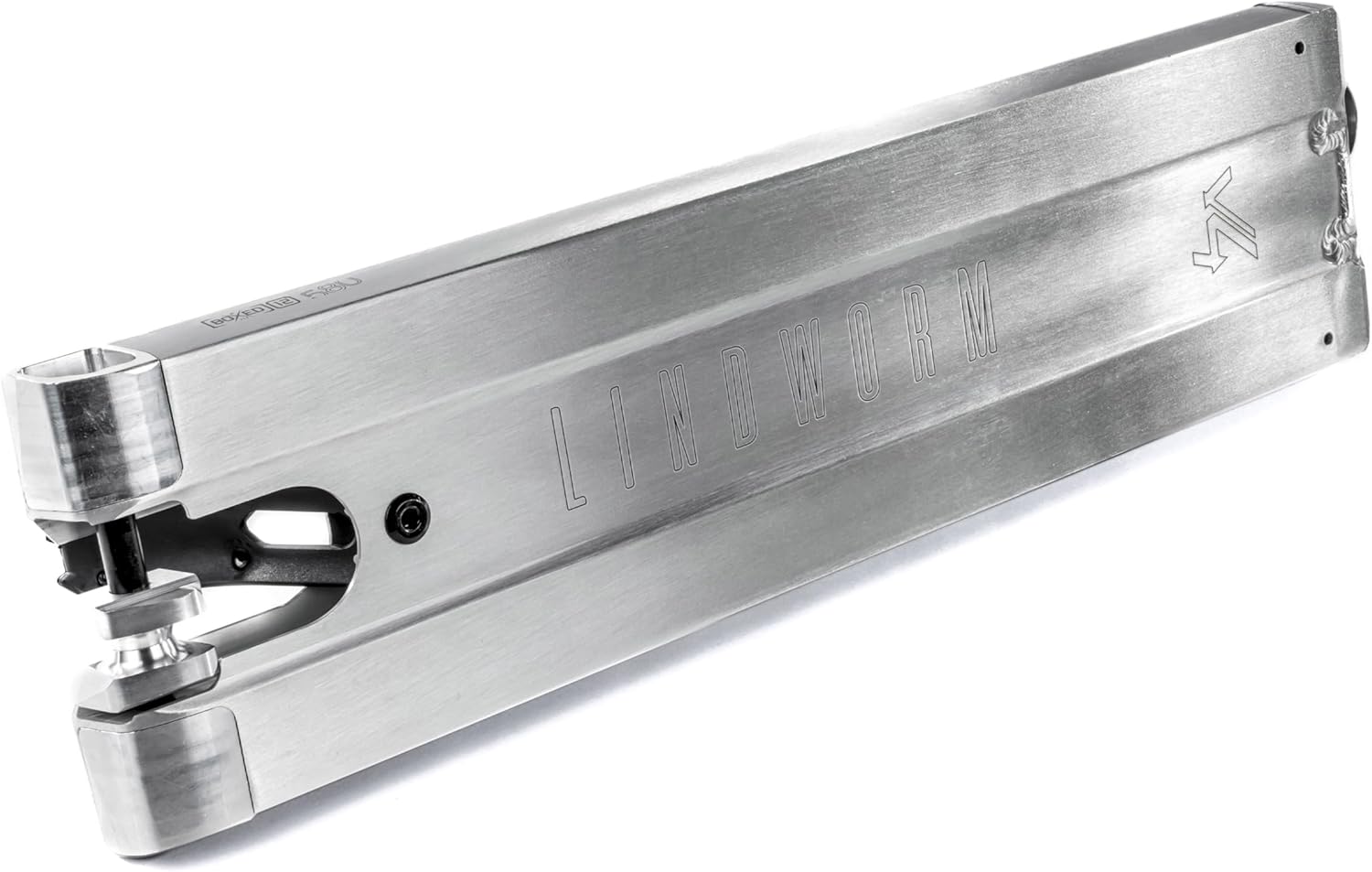 The Ethic DTC Lindworm v4 pro scooter deck is the evolution of the Lindworm v3 boxed deck and, for sure, the masterpiece of this collection. It's 8% lighter, 9% stronger and 10mm wider. It's now available in 4 different sizes, giving each pro scooter rider the possibility to find the deck that fits their perfect needs. Another improvement was brought to the deck ends: they're now in 7075-T6 and not welded any more. The shape of the deck-ends called Adaptive Extended Diameter (AED) improves the balance and the grind ability. It has the same curvature as 30mm-diameter pegs. Compatible both 8STD and 12STD wheels, the deck is coming with 8STD transition spacers with M8 axle. To allow this conversion, this deck features the new 12STD nylon brake v3 with switch diameter system allowing dual brake position (115mm/125mm). A grip tape is also included and to make sure it will last longer, the grip saver was improved. Available in 2 colors: Black / Raw. Technical specification : - Aluminum 6061-T6 - Weight: 4.44 lbs - Width: 150 mm (5.90 in) / 160 mm (6.30 in) - Length: 540 mm (21.3 in) / 560 mm (22 in) / 580 mm (22.8 in) / 600 mm (23.6) - Angle: 83.5° - Concave: Radius 1100 - Forged neck - 7075-T6 Deck ends with AED improved shape - AED Blunt plate improved - 12 STD compatible - 125 mm wheel compatible - Gripsaver v2 - New 12 STD Axles v2 - 8 STD transition spacers with M8 axle included - Griptape included - Nylon Brake 12 STD V3 (with Switch diameter system)