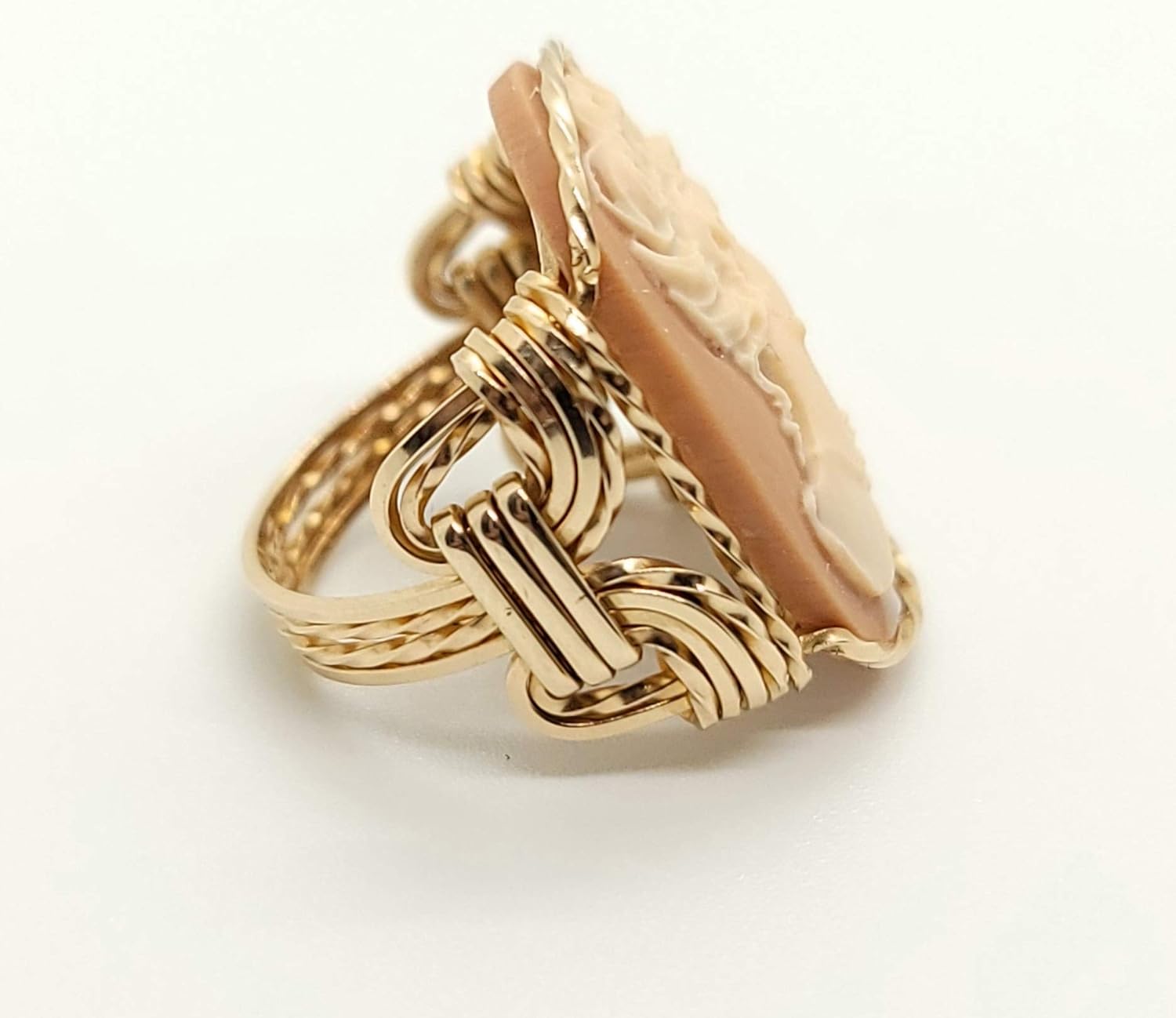 Fine Lady Cameo hand sculpted from the finest Jeweler's 14k Gold Filled in Artistic Designed Setting. Fine Lady blending into a coffee background. Lightweight and easy to wear. This unique artisan handmade Cameo ring is one of a kind! This is a classy fine handcrafted sturdy Cameo ring! This ring is great for casual or dressy wear!