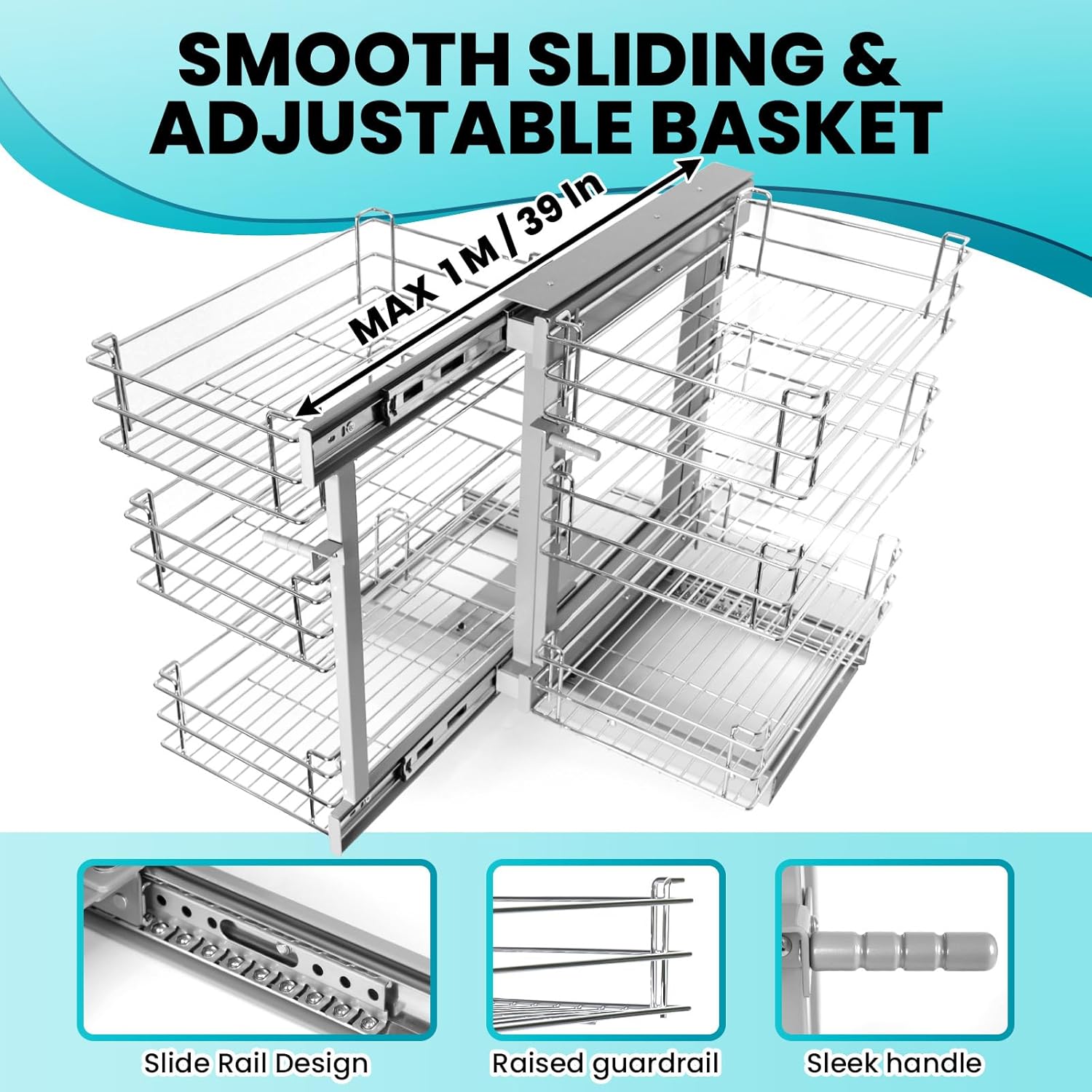 【Stylish and Durable Design】: This blind corner pull-out organizer is made from sturdy carbon steel, ensuring a long-lasting and reliable performance in your kitchen. The polished chrome finish on the 6 baskets not only adds a touch of elegance but also protects against rust and corrosion.【User-Friendly Assembly】: Designed for hassle-free installation, this organizer comes with pre-drilled holes for easy attachment to the interior of your cabinets. Compatible with cabinets as small as 29.5 ”W x 24”D x 25.6”H with a minimum opening of 14.5 inches, it fits both left and right opening cabinets, offering versatility in placement.【Spacious Storage with Load Capacity】 : Featuring 6 separate baskets, including 3 larger ones at 17.8 x 11 x 3.4 inches and 3 smaller ones at 16.5 x 9.5 x 3.4 inches, each with an 18 lbs load capacity, this organizer provides ample space for storing various kitchen items, from pots and pans to spices.【Effortless Access with Slide Rail Design】 : The smooth slide rails allow for a seamless pull-out motion, making it easy to access items stored in the back of your corner cabinet. The advanced silent damping technology ensures a uniform and quiet pull-out, enhancing the user experience.【Optimize Kitchen Space】 : This corner kitchen cabinet organizer helps you make the most of your blind corner cabinets, providing easy access to all your stored items. It's an essential organizational tool for any kitchen, keeping your kitchenware tidy and your space efficiently utilized.