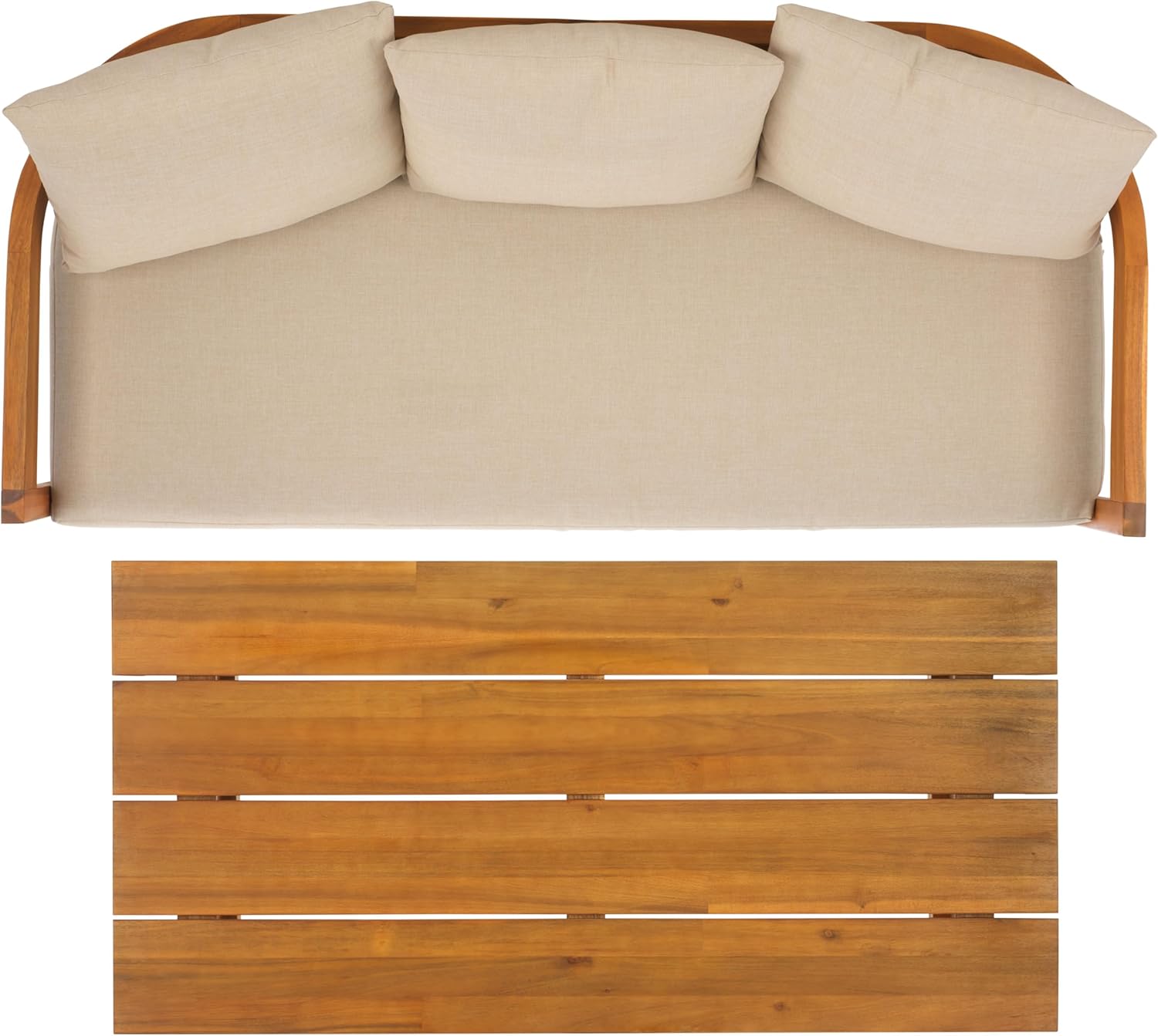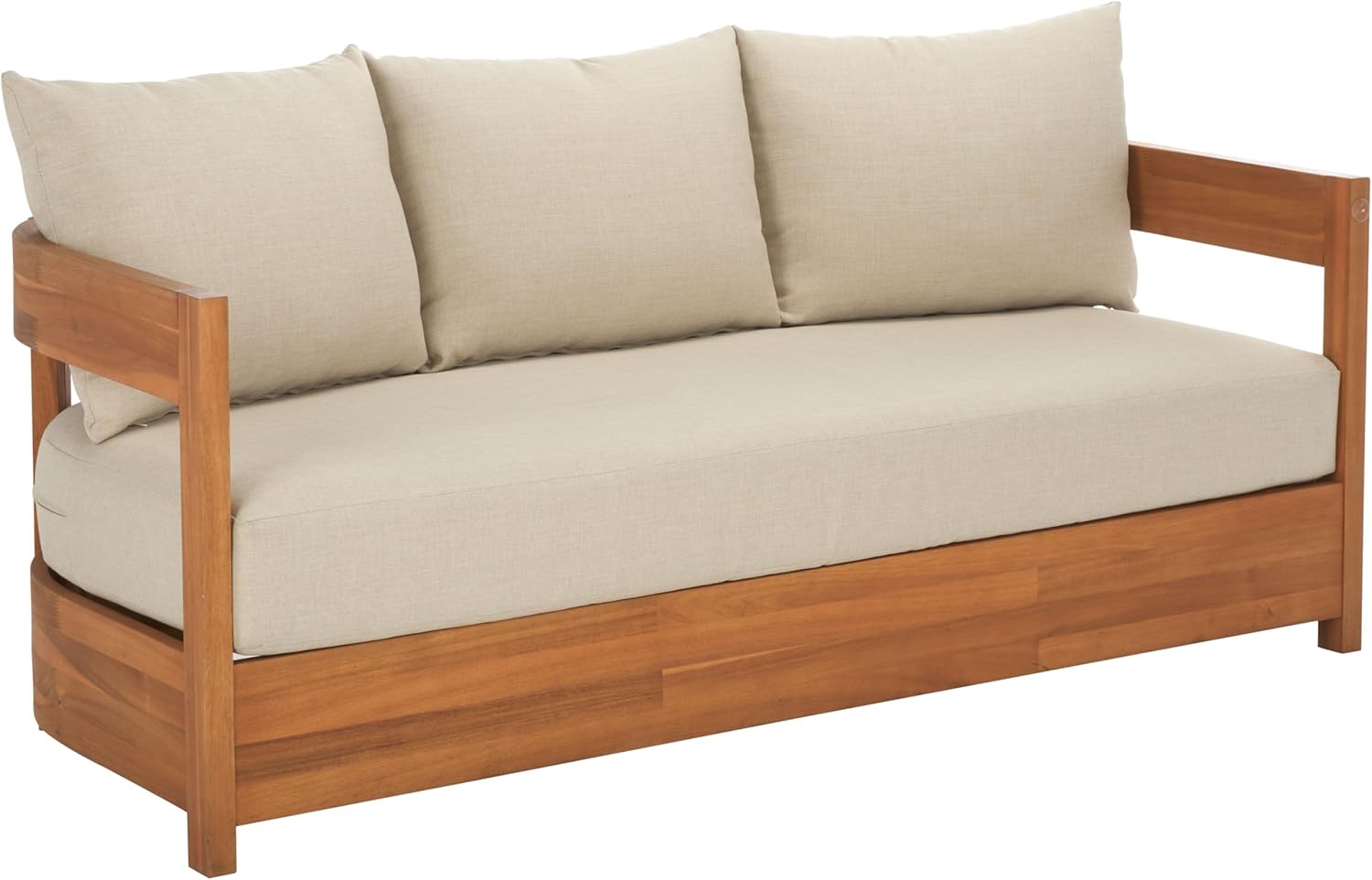 Create a stylish retreat with the SAFAVIEH Kento 3-Seater Sofa, crafted from natural wood and accented with plush taupe cushions. This modern sofa blends durability with comfort, offering a wide and deep seating area perfect for entertaining guests or lounging outdoors. The warm wood finish complements the neutral cushion tones, making it an adaptable centerpiece for patios, gardens, or decks. Designed to balance form and function, the Kento sofa provides generous seating for three while enhancing your outdoor décor with timeless charm.