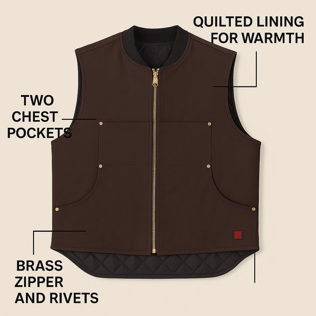 Enhance your professional or outdoor wardrobe with the Tough Duck Men's Moto Work Vest WV04. This vest is the perfect blend of style and functionality, specifically designed for motorcycle enthusiasts and tradespeople. The durable construction from high-quality cotton duck material not only offers exceptional comfort but also ensures it stands up to the demands of any task. Whether you're on a construction site, landscaping, or cruising on your motorcycle, the WV04 vest provides the necessary protection, warmth, and storage. Experience the durability, comfort, and functionality you need to tackle any challenge. Gear up with the Tough Duck Men's Moto Work Vest WV04, tailored for both motorcycle enthusiasts and hard-working professionals. Crafted from 12 oz premium cotton duck, this water-repellent vest combines style with functionality. It's designed to provide warmth, comfort, and durability in any setting, whether you're on the road or at the jobsite. Key Features: Durable Material: Made from 100% cotton with a water-repellent finish for superior durability. Insulation for Warmth: Lined with 6 oz polyester insulation to keep you warm in cold conditions. Reinforced Construction: Features brass rivets at stress points for added durability. Comfort and Fit: Rib knit collar and side panels for a comfortable, flexible fit. Ample Storage: Includes two chest pockets, two front scoop pockets, an inside pocket, and a media pocket. Customization Ready: Equipped with embroidery access zippers for easy personalization. Extended Protection: Designed with a drop back to guard against wind and cold. Whether tackling a tough job or enjoying a ride, the Tough Duck WV04 Moto Vest is your go-to choice for enduring comfort and functionality. Experience the perfect blend of protection and style.