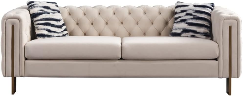 Products Type:SofaDesign:StandardSeating Capacity:3Upholstery Material:VelvetLeg Color:GoldenFrame Material:Solid+Manufactured WoodLeg Material:MetalSeat Fill Material:FoamSeat Construction:Sinuous SpringsBack Fill Material:Polyester FiberRemovable Cushions:YesRemovable Cushion Location:Seat and PillowsRemovable Cushion Cover:YesReversible Cushions:NoTufted Cushions:Yes Pillows Included:YesProduct Care:Clean with a dry clothArm Type:Square ArmSeat :Multiple cushion seatBack Type:Tufted backWeight Capacity:700 PoundsCushion Construction:FoamClean by lightly brushing and/or vacuuming to remove dustAssembly:Level of AssemblyFull Assembly Needed:Adult Assembly RequiredAdditional Tools Required:All Tools Included